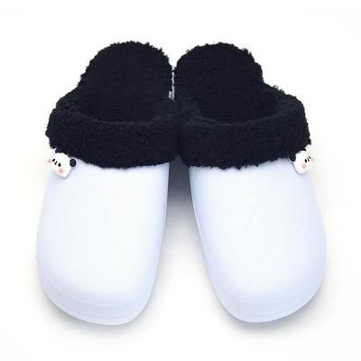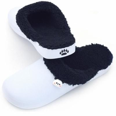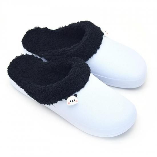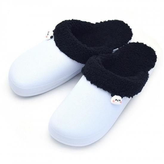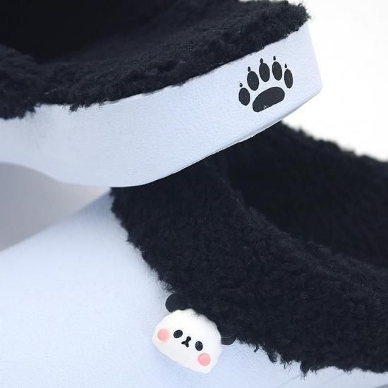パンダに見立てた白と黒のボア付きサボに、かわいいパンダがポイントです。